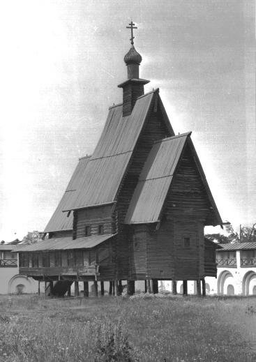 Церковь Спаса Преображения, нач. ХVIII в.Костромской, р-н/Костромская, обл, д. 1б, лит. Щ Церковь, рубленная из сосновых бревен, является замечательным образцом клетского храма с уникальной свайной конструкцией основания. Храм был построен в 1713 г. на месте сгоревшей деревянной шатровой церкви. По преданию, ее строителями были поволжские плотники братья Мулиевы родом из Ярославля. Храм подвергался неоднократным ремонтам. После одного из них, в 1770 г., он был вновь освящен. В 1876 г. церковь была обшита тесом с фасадов, а внутри оштукатурена, устроен новый иконостас. В 1899 и 1904 гг. деревянные сваи основания были заменены на кирпичные столбы. Одновременная церкви и связанная с ней переходами шатровая колокольня на шести дубовых сваях погибла в 1926 г. В 1908 г. рядом с ней была выстроена сохранившаяся до настоящего времени кирпичная колокольня. В 1956 г. храм был перевезен в музей из с. Спас-Вежи Костромского района и реставрирован во второй половине 1950-х гг. в своих первоначальных формах по проекту арх. Б.В. Гнедовского. Однако, простояв почти полвека на территории музея, церковь сгорела во время пожара 4 сентября 2002 г. В настоящее время принято решение о воссоздании этого уникального памятника деревянного зодчества. Основная композиция поставленной на 24 дубовых сваи церкви состояла из четверика, слегка вытянутого в поперечном направлении, и более низких прирубов пятигранной апсиды и почти квадратной в плане трапезной. С трех сторон храм и трапезная были окружены закрытой галереей-гульбищем, опиравшейся на консольные бревна. С запада на нее поднималась длинная одномаршевая лестница с крыльцом на нижней площадке. Храм и трапезная были рублены «в обло», апсида «в лапу». Все три объема завершались высокими и очень крутыми двускатными самцовыми кровлями с охлупнями и курицами. Кровля основного четверика была увенчана квадратным срубом с луковичной главой на цилиндрическом барабане. Стены храма и трапезной имели повалы, которые, однако, почти не были заметны из-за свесов кровли. Объемно-планировочная композиция церкви имела ряд особенностей: трапезная в плане представляла собой неправильный четырехугольник, четверик и апсида были также “косоугольны”, ширина галереи была неодинакова в различных местах. Однако зрительно эти изменения геометрических форм не воспринимались. Отклонения от прямых линий наблюдались и у кровель храма, например, скаты кровли четверика имели небольшую кривизну. В южной и северной стенах храма были устроены косящатые окна, а в апсиде также и волоковые. Каркасные стены галереи были забраны тесом “в елку” и прорезаны окнами с килевидными завершениями. Наиболее нарядными элементами церкви являлись резные причелины и полотенца, украшенные городками, солярными знаками и другими мотивами, характерными для народной архитектуры. С галереи в храм с трех сторон вели двери в колодах. Помещения храма и трапезной, сообщающиеся между собой прямоугольным проемом, имели плоские дощатые перекрытия по балкам. Перед восстановленным четырехъярусным тябловым иконостасом была сделана солея со ступенями и двумя клиросами. Вдоль стен трапезной и у западной стены четверика были устроены деревянные лавки. Полы были выполнены из плах. Лит.: В. Соколов. О церкви в селе Спас-Вежи // Костромская старина. Вып. 6. Кострома, 1905. С.136-143; В. и Г. Холмог