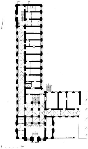 Училище духовное, кон. XIX в.Костромской, р-н/Костромская, обл, д. 8, лит. А, вост. часть Духовное училище – выразительный образец церковного учебного заведения в губернском городе, построенного в период эклектики в русском стиле. Оно сооружено в 1894 г. по проекту, утвержденному в 1889 г. Расположенное на углу квартала монументальное здание служит важным архитектурным акцентом в центральной части города. Протяженным (западным) фасадом оно выходит на ул. Князева, торцевым (северным) на пр. Мира. Вдоль красной линии проспекта перед отступающим в глубину участка отрезком фасада устроена ограда с кирпичными парапетом и столбами. Металлическая решетка между столбами имеет рисунок наклонной сетки. Двухэтажное с подвалом кирпичное здание образует Г-образную, вытянутую по оси север-юг форму в плане, усложненную выступом с северной стороны. Массивный объем обладает развитым силуэтом, который определяют два крупных шатра над центральной частью основного корпуса и пологий купол с главой, венчающий домовую церковь в торцевой части здания на углу квартала. Западный фасад имеет симметричную пятичастную композицию с 19 осями окон. Средняя и боковые части выделены "бриллиантовым" рустом первого этажа, арочными окнами второго и венчающими аттиками. Дробную пластику фасада дополняют лопатки с ширинками, пояса городков и зубцов, крупные рельефные кресты и другие детали. Узкий северный торец в 5 осей проемов с аналогичным характером декора акцентирован порталом главного входа. Арочный проем сохранил двустворчатую филенчатую дверь, украшенную "бриллиантовым" рустом и резным орнаментом. Дворовые фасады решены значительно проще. Они не перегружены деталями и отличаются более четкой тектоникой. Их стены прорезаны в обоих этажах окнами с лучковыми перемычками, заглубленными в крупные ниши, и обработаны поясами городков. Хорошо читаются горизонтальные членения, в том числе венчающий карниз с машикулями. Внутренняя планировка имеет характерную для учебных заведений коридорную систему с обширным вестибюлем и торжественной лестницей. Широкий коридор, на первом этаже разделенный подпружными арками и перекрытый крестовыми сводами, расположен вдоль уличных фасадов и объединяет все классы, выходящие окнами во двор. Самостоятельным звеном в пространстве здания является северный выступ с вестибюлем на первом этаже и домовой церковью на втором. Вестибюль в передней части перекрыт сводами Монье, а в глубине его пространство разделено четырьмя парами крещатых столбов, на которые опираются подпружные арки и крестовые своды. Широкая трехмаршевая лестница с литыми ажурными балясинами поднимается из вестибюля на второй этаж. Ее верхняя площадка сообщается с коридором двумя крупными арочными проемами. Двусветный зал церкви с двумя более низкими компартиментами на торцах (алтарь и притвор) имеет плоские перекрытия. На стенах сохранились фрагменты масляной живописи (Новозаветные сюжеты и растительный орнамент). Лит.: Памятники архитектуры Костромской области. Вып. 1. Ч. 1. Кострома, 1996. С. 199-200. ГАКО. Ф. Р. 513 (Е.В. Кудряшов). Оп. 1. Д. 106. |